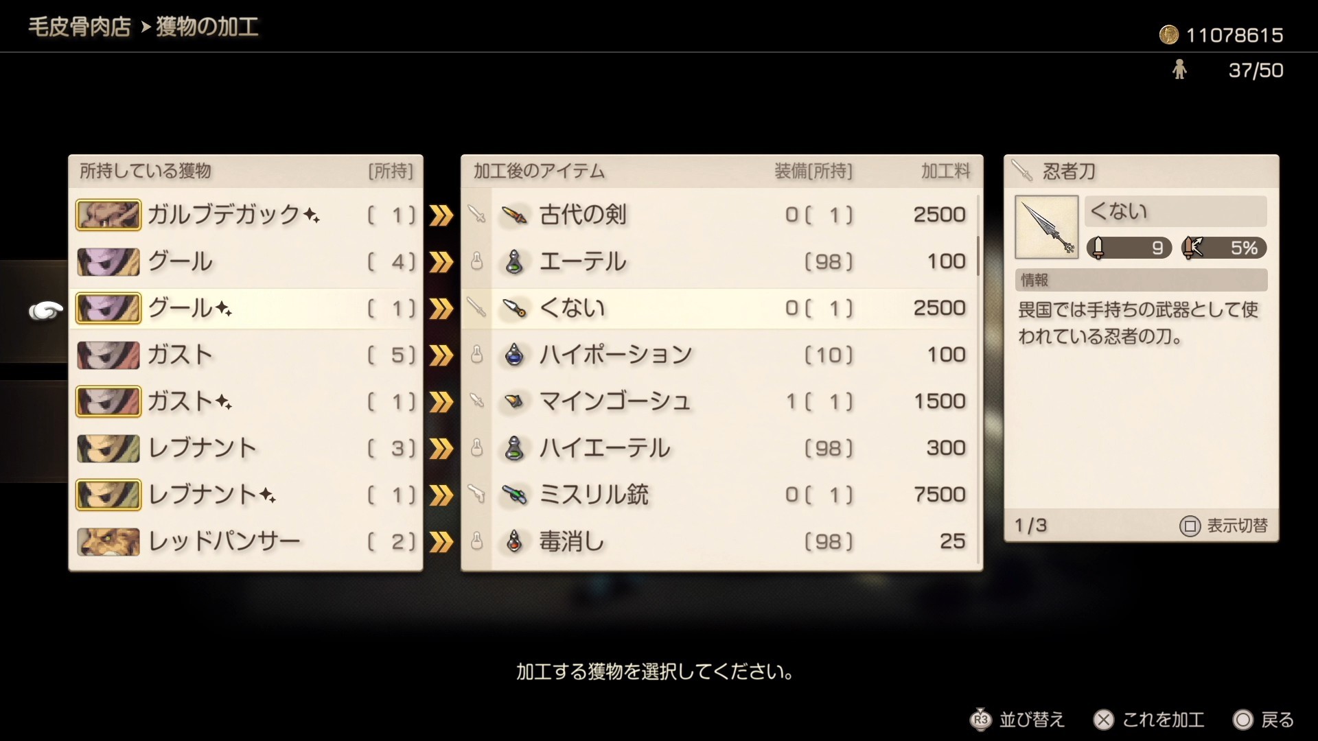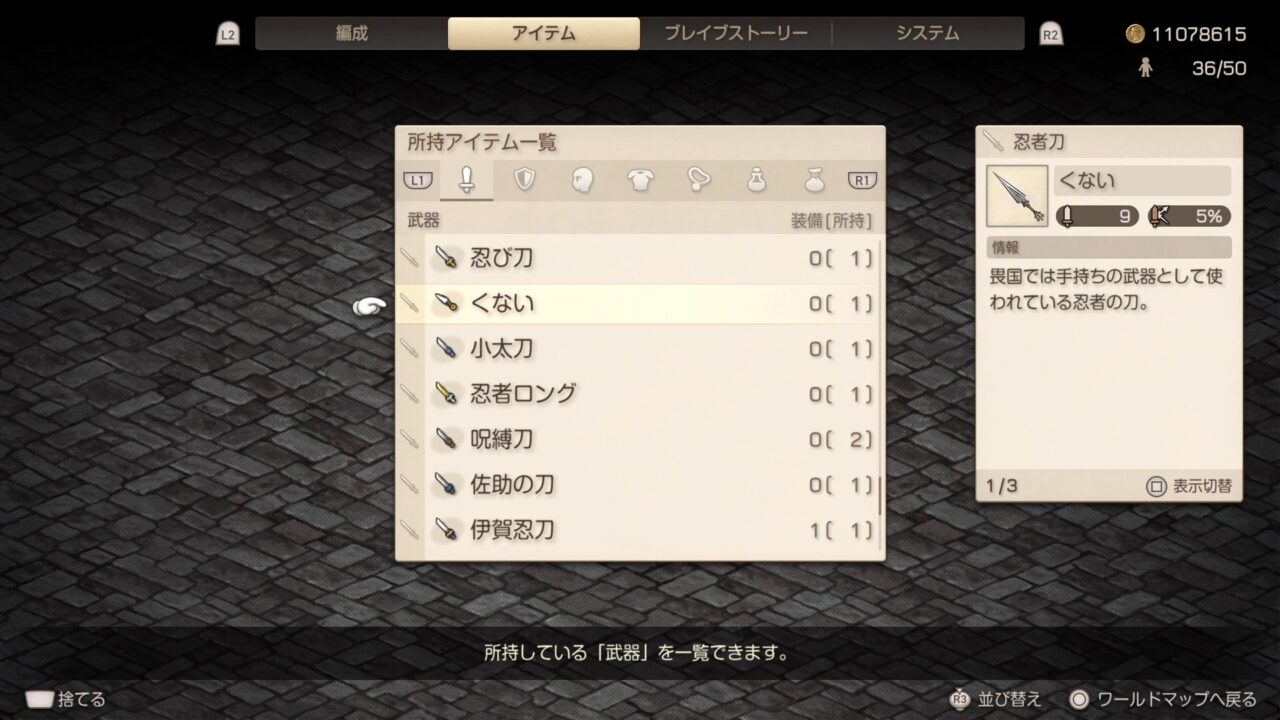 くないが売り出されてからオーボンヌ修道院の三連戦をクリアしたらまた売り出される忍者刀となり 攻撃力が1上がっているため その時点で最高の火力を出すにはほしいのですが 2本買うとなるとなかなかの出費です。